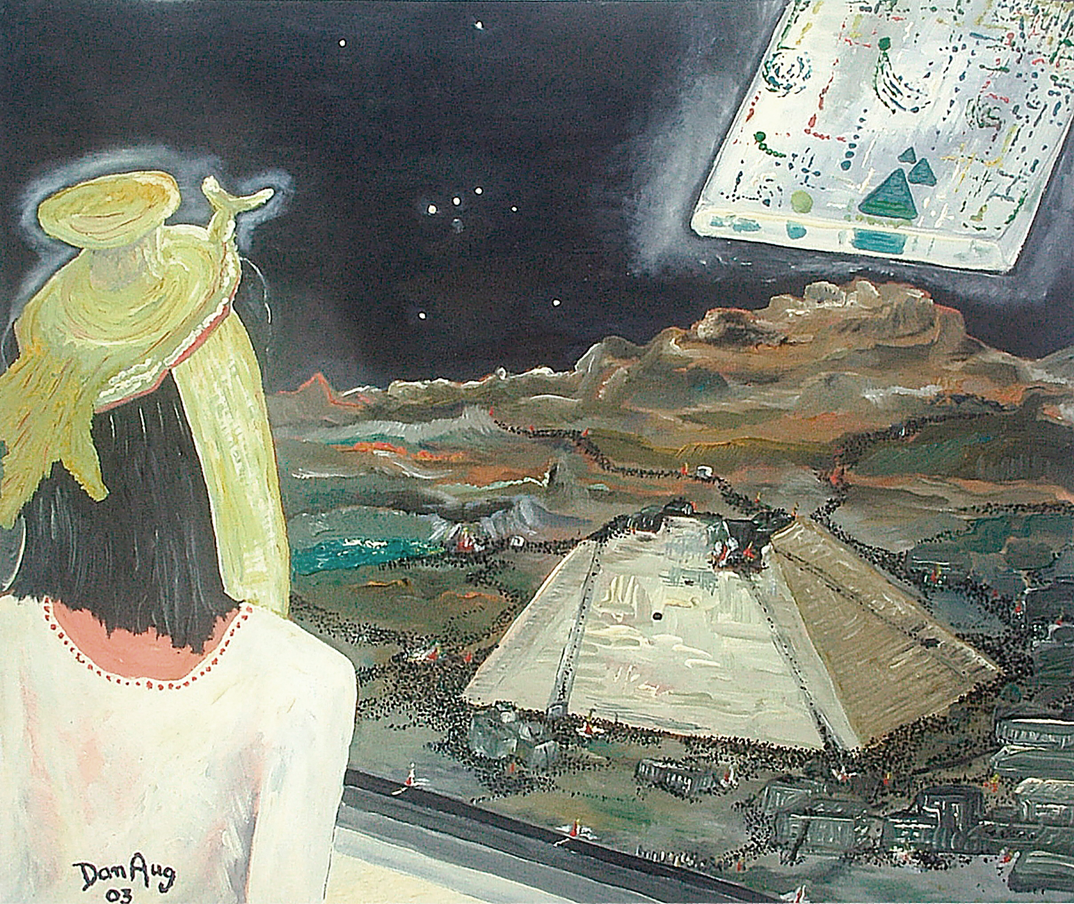 Rotating selection of artworks from Dan Aug’s 46-pieces Art Series, Dream of a Night in Giza. This slideshow highlights key paintings that weave astronomy, Egyptian myth, and speculative fiction into a single visual narrative. Each image appears at full proportion to honor texture, metallic sheen, and geometric construction, then flows to the next with a steady cadence. Together, these pieces trace the journey of Neferu across time and cosmos—inviting contemplation, wonder, and a sense of radiant mystery that lingers between frames.